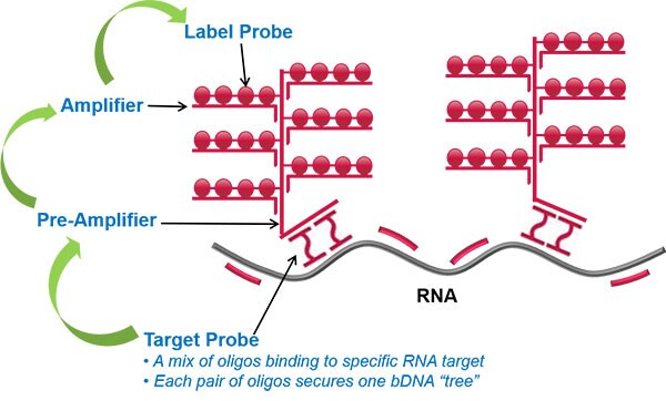 Sequential hybridization of bDNA pre‑amplifier, amplifier, and label probes builds a highly amplified signal. - Detection